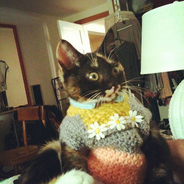 着ているのは、飼い主さんの手作りセーターなのかしらぁ